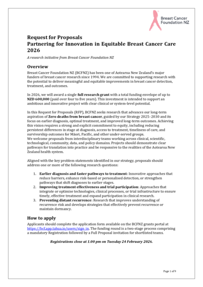 Breast Cancer Foundation NZ (BCFNZ) is now accepting applications for the Partnering for Innovation in Equitable Breast Cancer Care (PIEBC) 2026 grant round. This year, BCFNZ will award a single full research grant of up to NZD 600,000, to be delivered over four to five years.